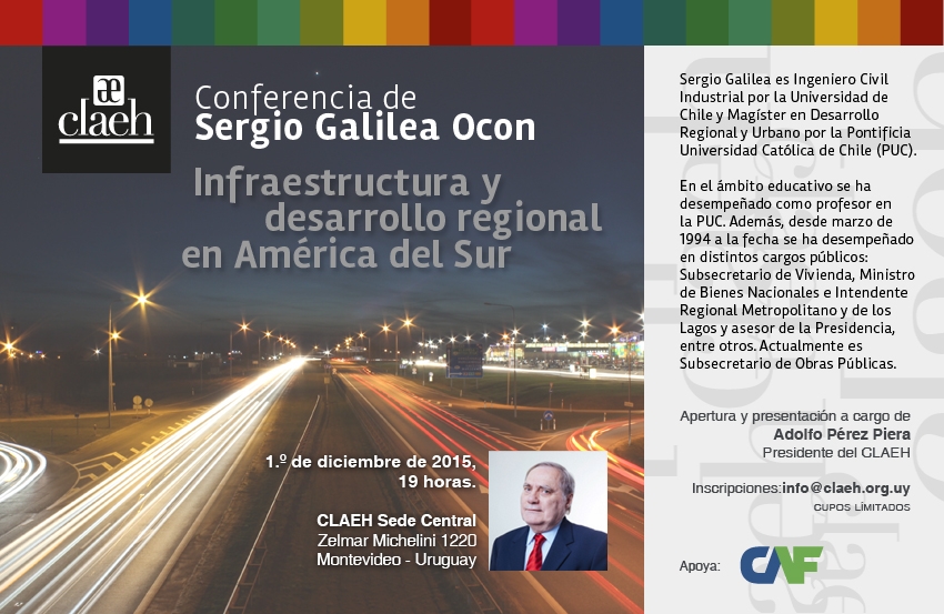 El CLAEH tiene el agrado de invitarle a la conferencia "Infraestructura y desarrollo regional en América del Sur" a cargo de Sergio Galilea, actual subsecretario de Obras Públicas del gobierno de Chile.