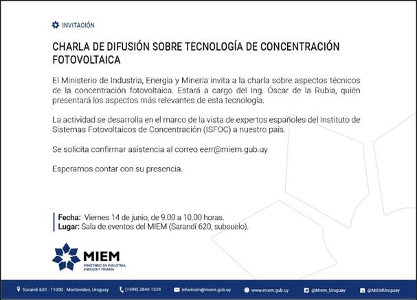 Se invita a la charla sobre aspectos técnicos de la concentración fotovoltaica. La actividad estará a cargo del Ing. Óscar de la Rubia.