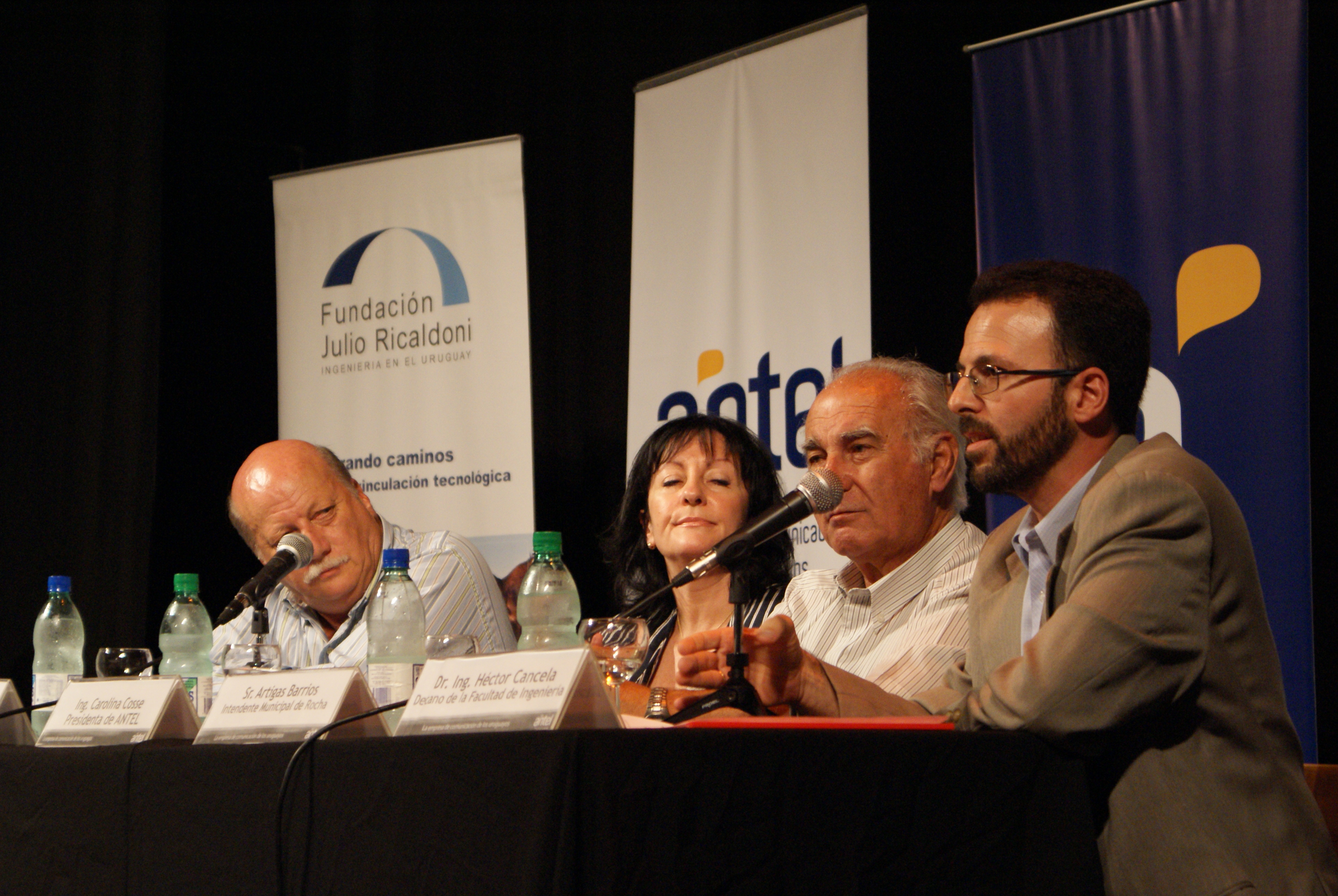 En la mesa de apertura estuvieron el Dr. Ing. Héctor Cancela, decano de la Facultad de Ingeniería, la Ing. Carolina Cosse, presidenta de ANTEL, el Sr. Artigas Barrios, intendente de Rocha y Arq. Jaime Sztern, director del Centro Universitario de la Región Este.