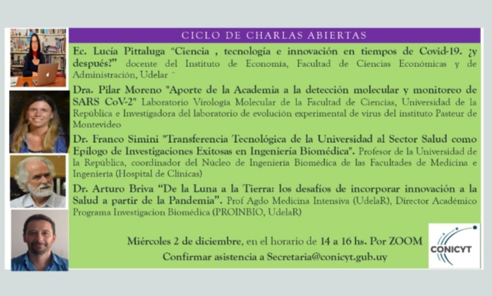 En el marco del Ciclo de charlas abiertas organizado por la Comisión Nacional de Investigación Científica y Tecnológica (CONICYT), el próximo miércoles 2 de diciembre de 14 a 16hs se desarrollará una charla sobre Ciencia en tiempos de COVID, por la plataforma Zoom.