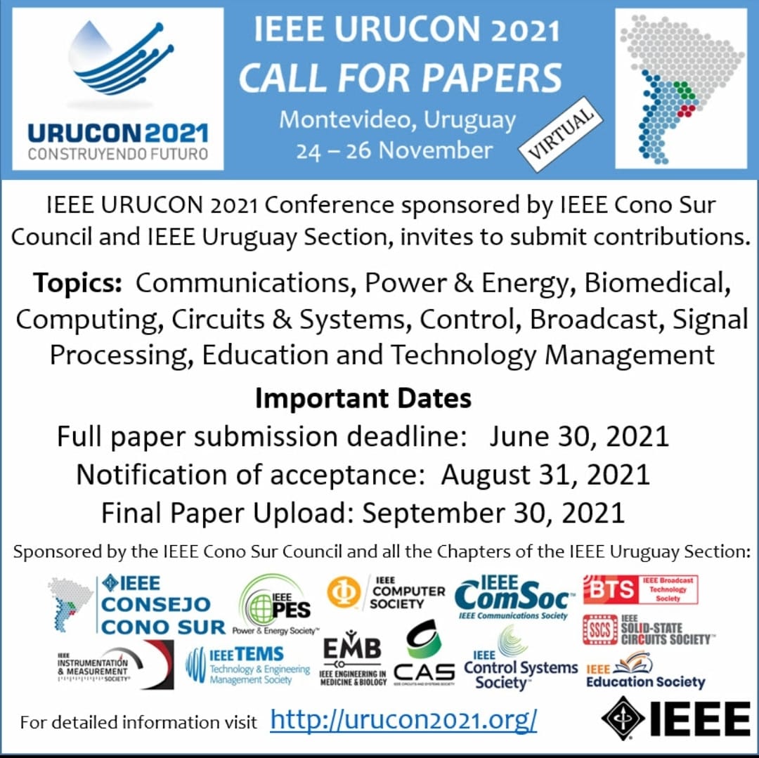 La Conferencia IEEE Urucon 2021 patrocinada por el Consejo IEEE Cono Sur y la Sección IEEE Uruguay, invita a profesionales de ingeniería de industrias, organizaciones de I + D, instituciones académicas, departamentos gubernamentales y académicos de investigación, a presentar presentaciones profesionales originales y contribuciones de investigación completas.