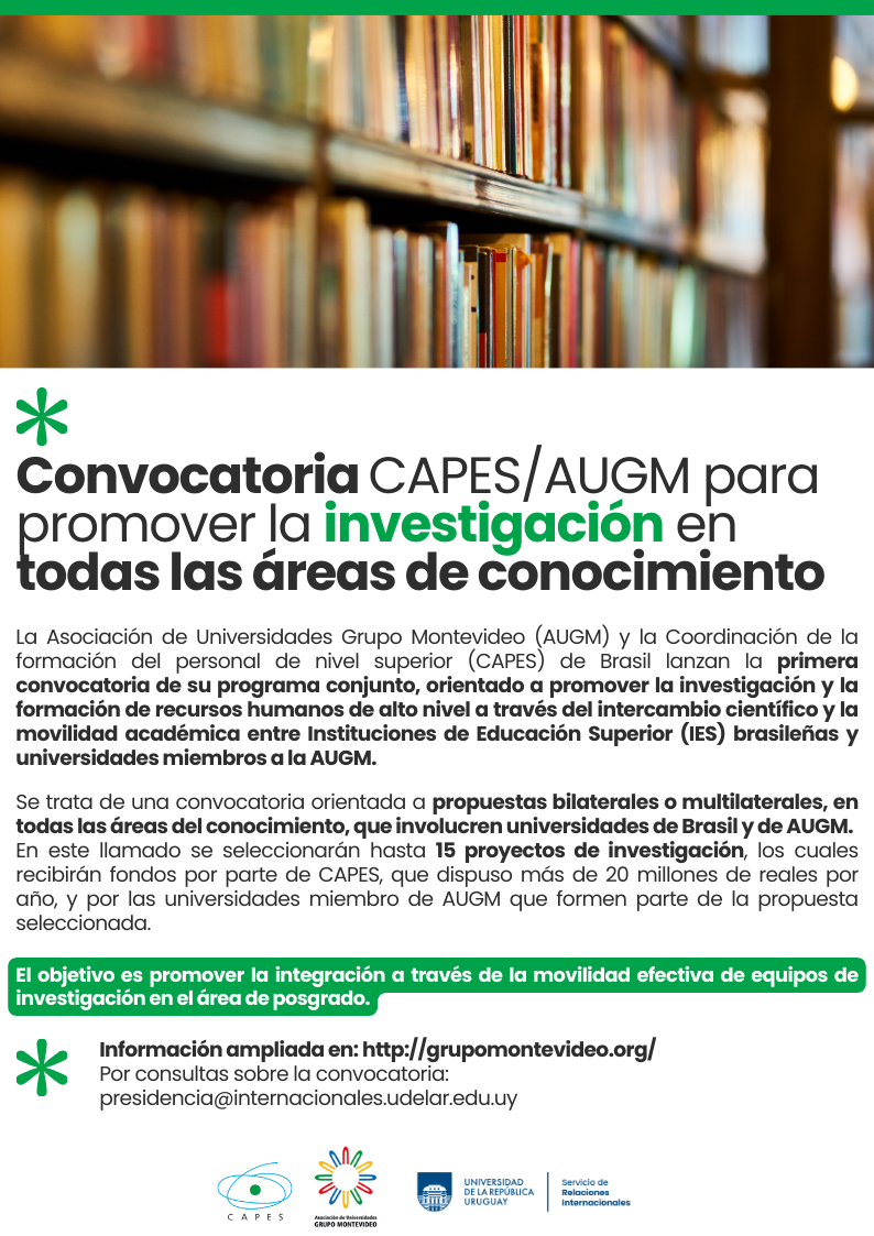 El gobierno de Brasil anuncia la apertura del programa CAPES/AUGM, que tiene como objetivo seleccionar proyectos conjuntos de investigación en el ámbito del Programa CAPES – AUGM, para promover la investigación y la formación de recursos humanos de alto nivel a través del intercambio científico y la movilidad académica entre Instituciones de Educación Superior (IES) y Universidades miembros de AUGM,