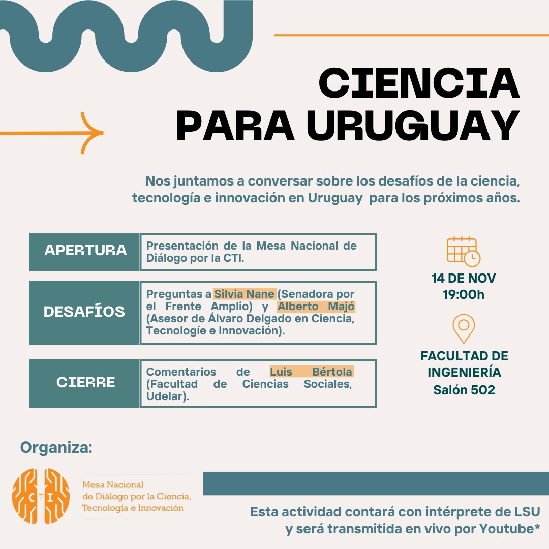 El próximo jueves 14 de noviembre habrá una mesa de discusión sobre los desafíos en ciencia, tecnología e innovación en Uruguay para los próximos años. Participan: Silvia Nane (Senadora por el Frente Amplio), Alberto Majó (Asesor de Álvaro Delgado en CyT y Director de la Dirección Nacional de Ciencia y Tecnología), y Luis Bértola (Profesor Titular del Programa de Historia Económica y Social, Facultad de Ciencias Sociales, Udelar).