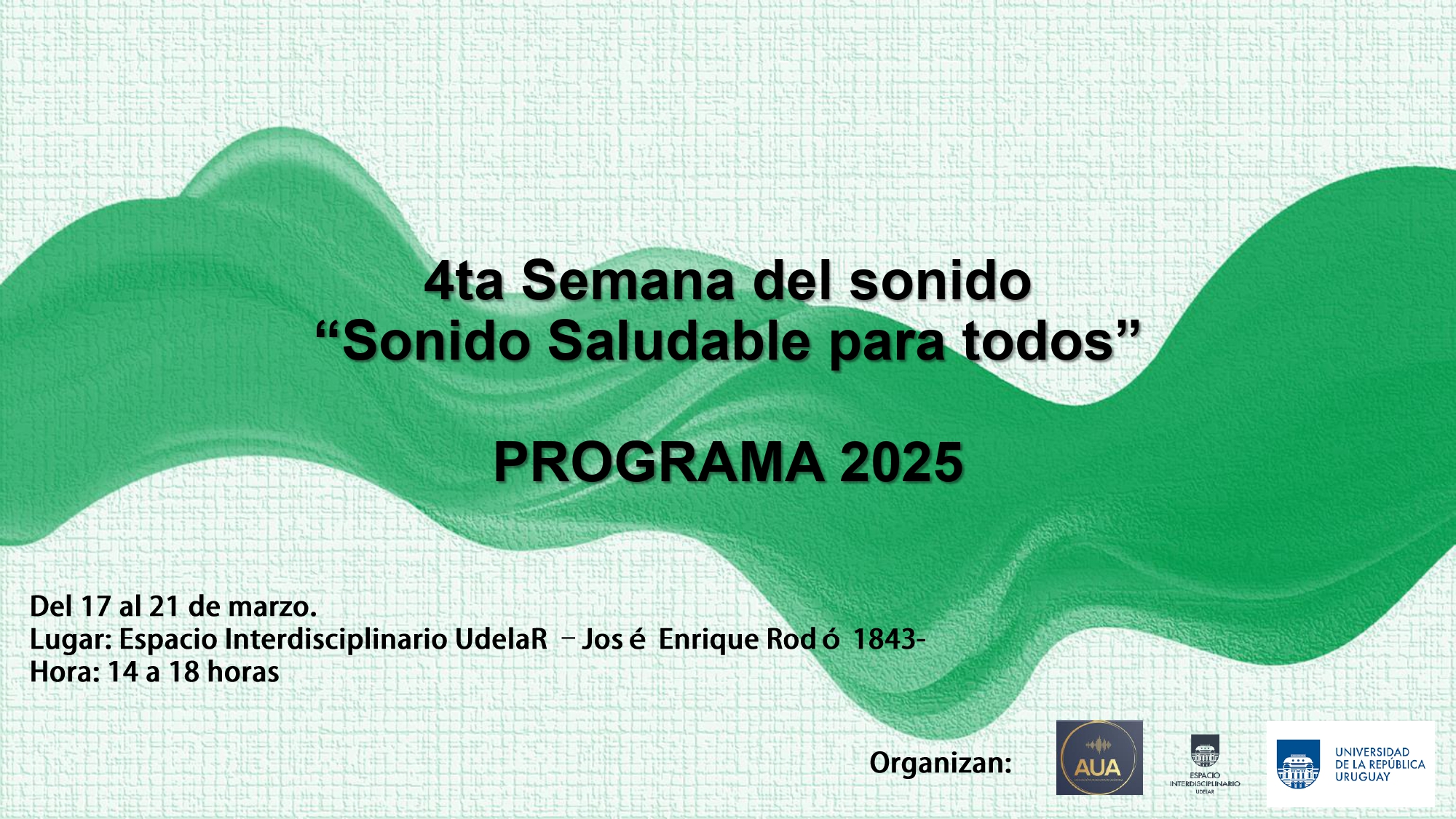 Del 17 al 21 de marzo de 2025 vuelve una nueva edición de la semana “Sonido saludable para todos”, un evento organizado por el Departamento de Ingeniería Ambiental del IMFIA de la Facultad de Ingeniería, con el apoyo de la Asociación Uruguaya de Acústica (AUA). La Asociación Uruguaya de Acústica (AUA), es una asociación civil sin fines de lucro que reúne a decenas de personas vinculadas a la acústica, conformando un espacio para estimular el desarrollo, la investigación y el intercambio de conocimientos.