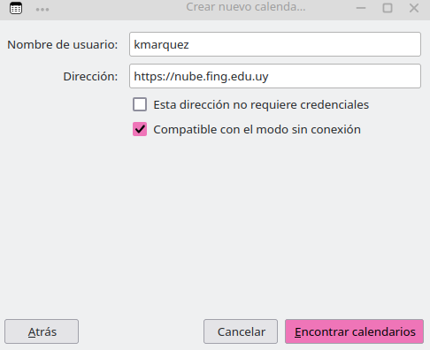 - Colocar su nombre de usuario en el campo Nombre de usuario, y en el campo Dirección colocar https://nube.fing.edu.uy. Luego, presionar Encontrar calendarios.
