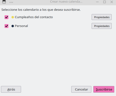 - Se abrirá una ventana con los calendarios encontrados. Tildar los que quiera sincronizar y presionar Suscribirse.