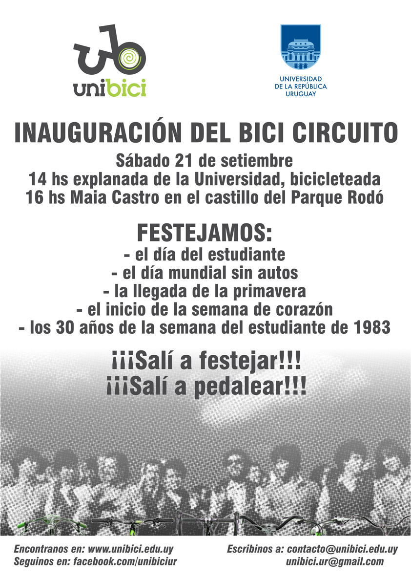 14:00 hs Inauguración del bici circuito a cargo de la Intendenta de Montevideo, Ana Olivera y el Rector de la Udelar, Rodrigo Arocena. Explanada de la Universidad de la República.