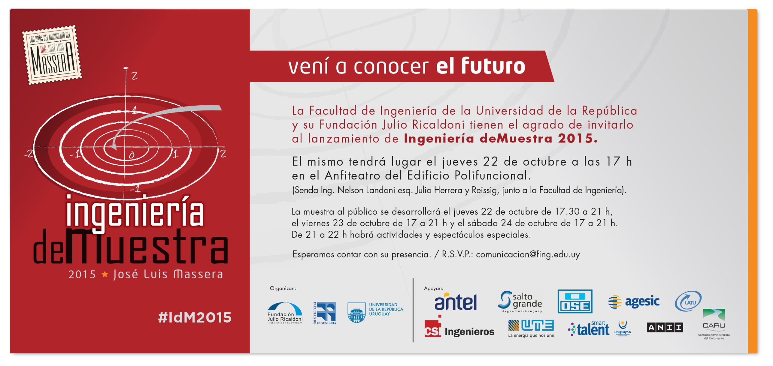 Ingeniería deMuestra, el evento anual organizado por la Facultad de Ingeniería de la Udelar en conjunto con su Fundación Julio Ricaldoni, se desarrollará los días jueves 22, viernes 23 y sábado 24 de octubre de 2015.