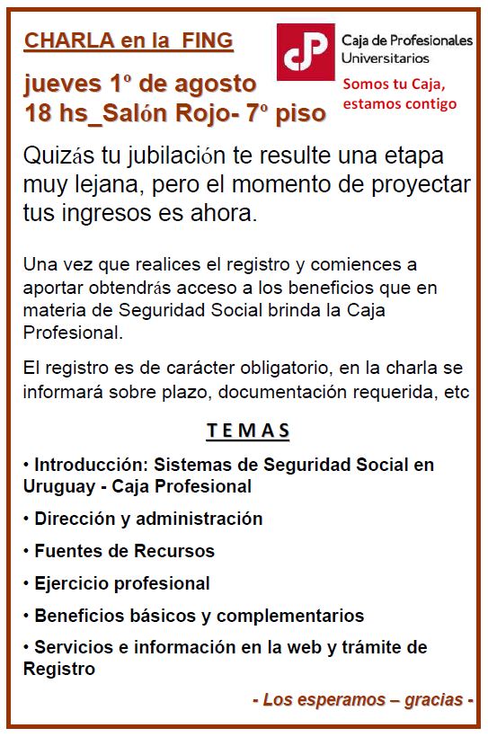 El jueves 1 de agosto a las 18 horas, la Caja de Profesionales Universitarios realizará una charla informativa en la que explicarán sus servicios de manera detallada para los estudiantes y demás personas interesadas. El registro a la CPU es obligatorio para los profesionales y en la charla se informará sobre plazos, documentación y prestaciones.