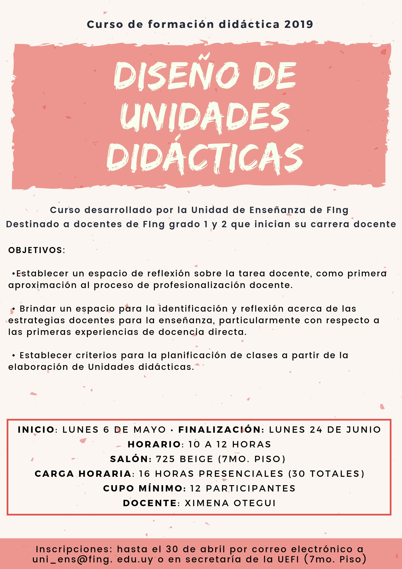 Hasta el 30 de abril por correo electrónico: uni_ens@fing.edu.uy o personalmente en la secretaría de la UEFI (séptimo piso). El curso tiene un cupo de 12 participantes.