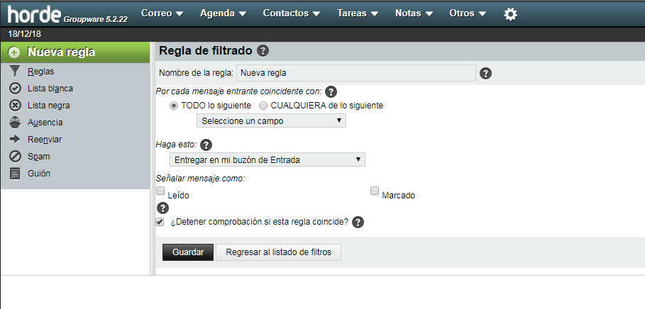 - ¿Detener comprobación si esta regla coincide?: Esta opción si está marcada implica que el filtro que cumpla primero los requerimientos ejecutará la acción definida en la regla y no se aplicarán otros filtros a ese correo.