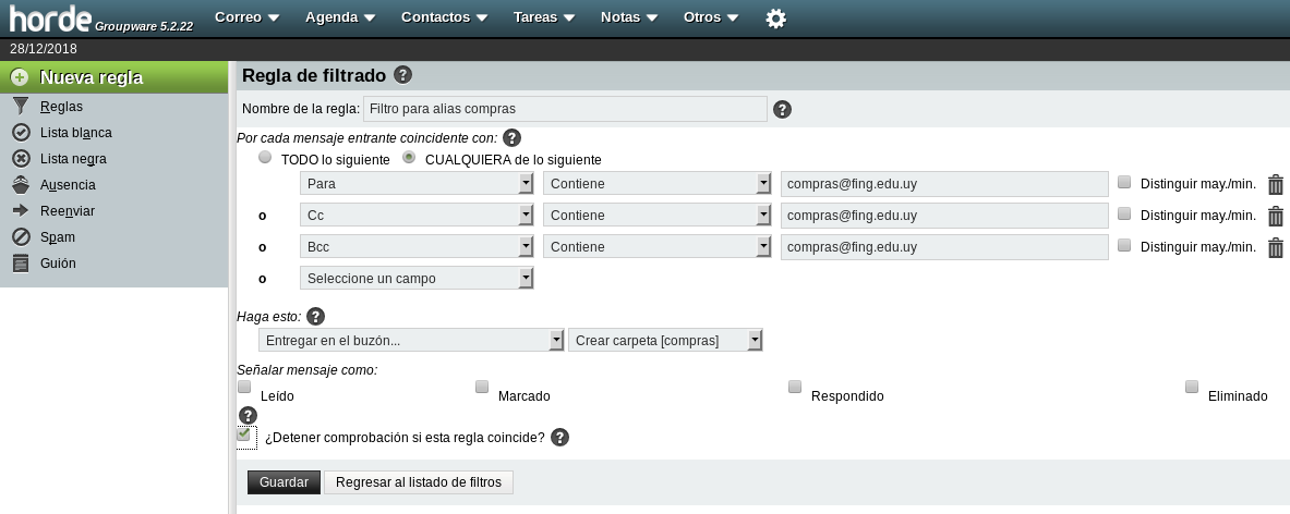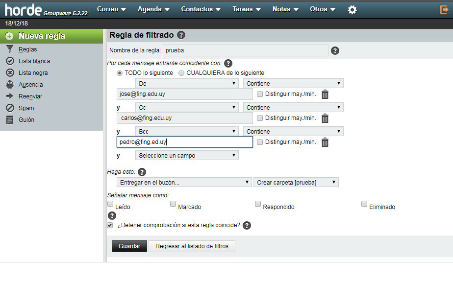 O sea, si en “De” se ingresó jose@fing.edu.uy, en “Cc” carlos@fing.edu.uy y en “Bcc” pedro@fing.ed.uy la regla solo se aplicará si el correo a filtrar viene de jose@fing.edu.uy y fue con copia a carlos@fing.edu.uy y con copia oculta a pedro@fing.ed.uy.