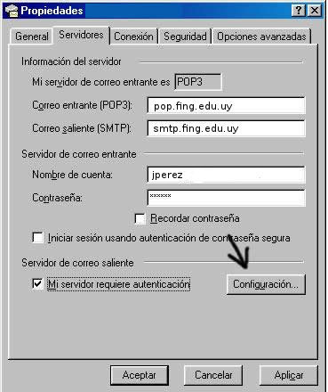 - Asegúrese de que en las opciones: 'Outgoing mail (SMTP)' figure 'smtp.fing.edu.uy' y en 'Nombre de cuenta' figure el nombre de su usuario. En el ejemplo 'jperez'.