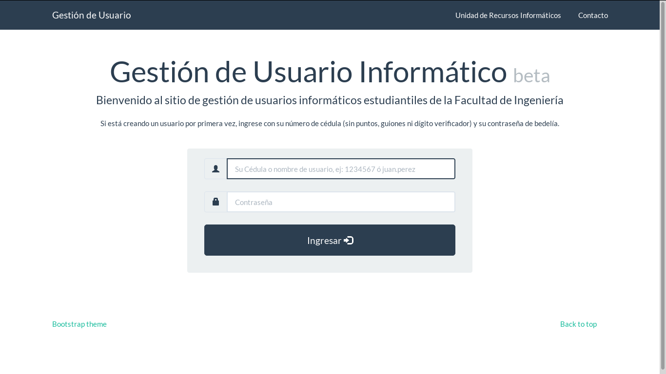 El presente instructivo pretende describir los pasos que se deben seguir para gestionar un usuario estudiantil. A todo estudiante ya sea de grado, posgrado o educación permanente luego de que es aprobada su inscripción en bedelía, se les hará entrega de su usuario Udelar, con este usuario activado se puede proceder con la creación del usuario informático de Facultad de Ingeniería.