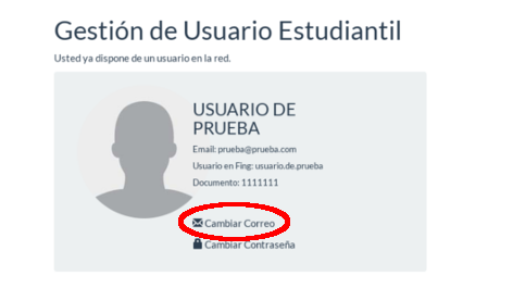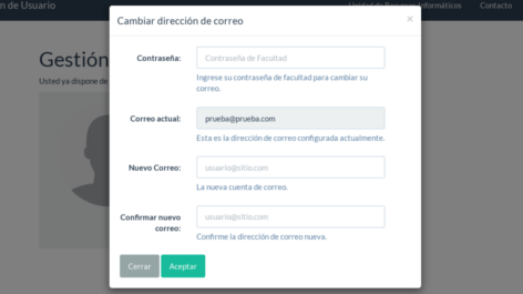 A continuación se verá la siguiente pantalla en la que, además de volver a ingresar la contraseña de su usuario estudiantil (en el caso del ejemplo, la contraseña del usuario usuario.prueba), se deberá escribir el nuevo correo que se quiere asociar a la cuenta en dos oportunidades.