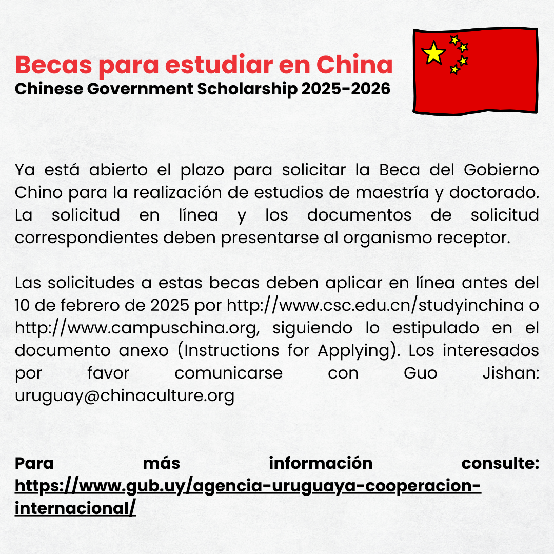 Hasta el 10 de febrero de 2025 se encuentran abiertas las inscripciones para solicitar becas del Gobierno Chino para la realización de maestrías y doctorados en China durante el 2025-2026. La solicitud es on line y deben presentarse los documentos correspondientes en el organismo receptor: https://www.campuschina.org/