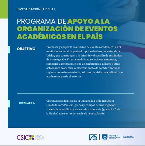 Objetivo: Promover y apoyar la realización de eventos académicos en el territorio nacional, organizados por colectivos docentes de la Udelar, que contribuyan a la difusión y discusión de resultados de investigación. En esta modalidad se incluyen simposios, seminarios, congresos, ciclos de conferencias, talleres y otras actividades académicas colectivas, tanto de carácter nacional, regional como internacional, así como la visita de académicos/as desde el exterior.Destinado a: Colectivos académicos de la Universidad de la República (unidades académicas, grupos y equipos de investigación, sociedades científicas) a través de un docente (grado 2 a 5 de la Udelar) que sea responsable de la postulación.