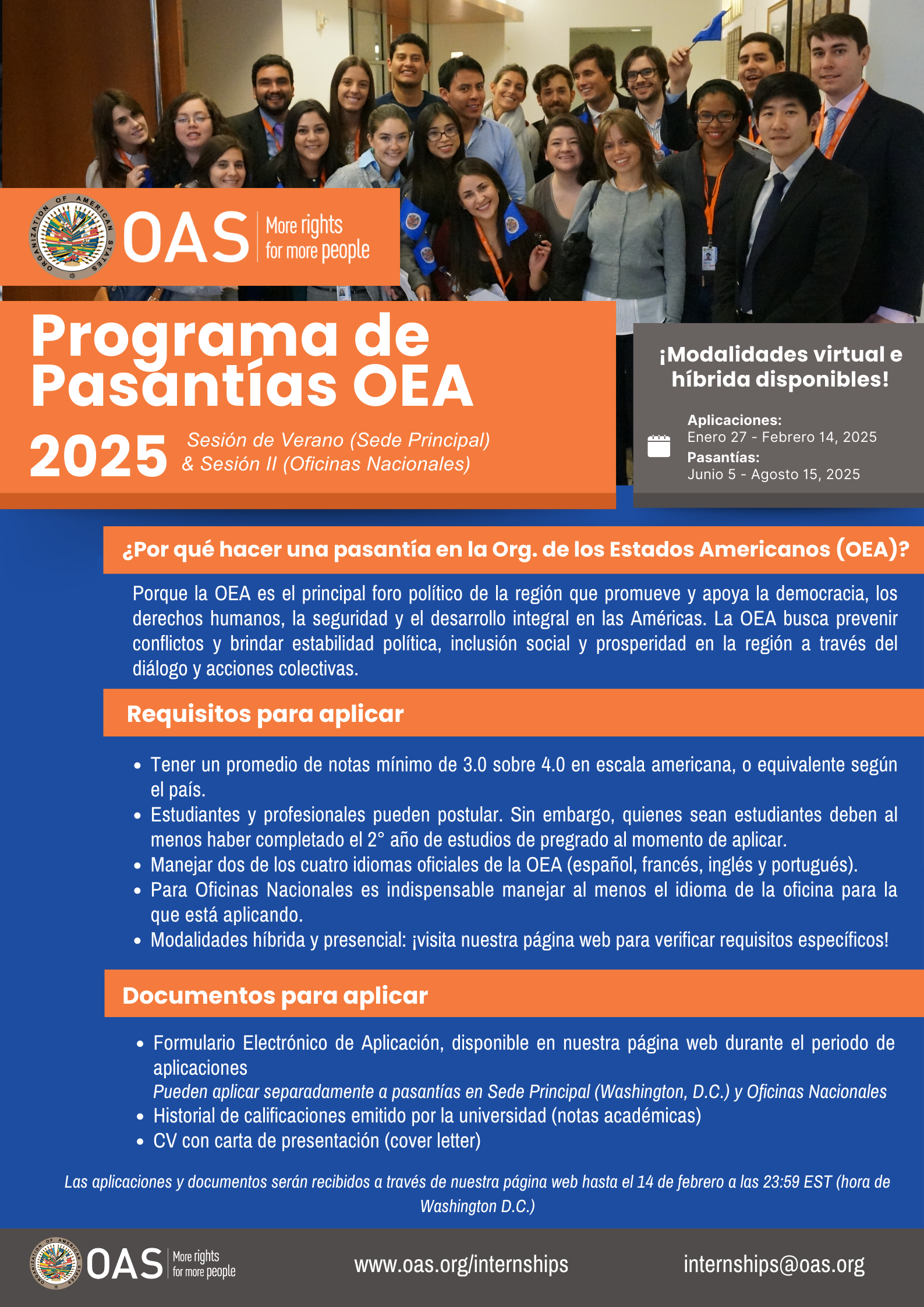 Plazo: 28-01-2025 -La Oficina Nacional de la OEA en Uruguay abrió el período de postulación a la próxima sesión de pasantías en las Oficinas Nacionales hasta el 14 de febrero de 2025, a desarrollarse desde el 5 de junio al 15 de agosto de 2025.