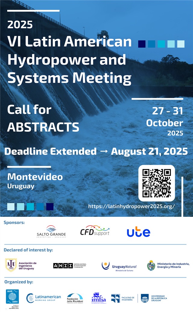 Plazo: 15-03-2025 -Del 27 al 31 de octubre de 2025 tendrá lugar el VI Latin American Hydropower and Systems Meeting en una nueva edición que se llevará a cabo en Montevideo, Uruguay. Este evento reúne a investigadores/as, profesionales, estudiantes y empresas del sector hidroenergético para compartir los últimos avances en el desarrollo, operación y sostenibilidad de los sistemas hidroeléctricos.