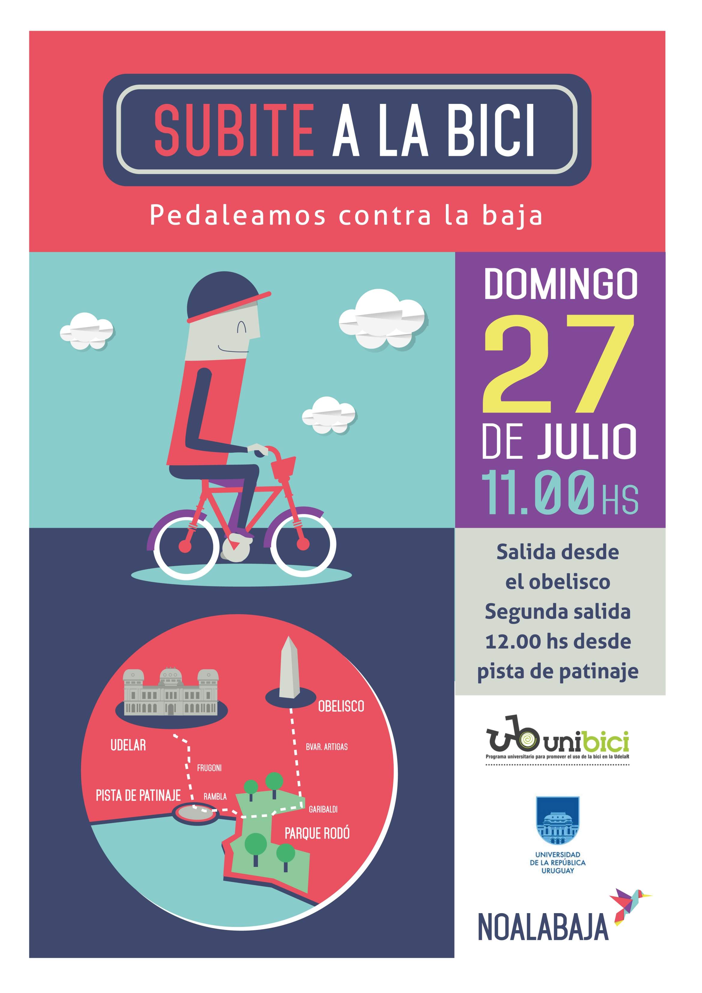 El domingo 27 de julio se realizará una bicicleteada contra la baja de la edad de imputabilidad penal. El punto de encuentro será en el Obelisco montevideano a las 11 horas. De ahí se recorrerá hasta la Pista de Patinaje en la Rambla y Jackson en donde estarán bikepolo y clowns en bici; luego se partirá a las 12 horas rumbo al callejón de la Universidad, ubicado en Emilio Frugoni y 18 de Julio.