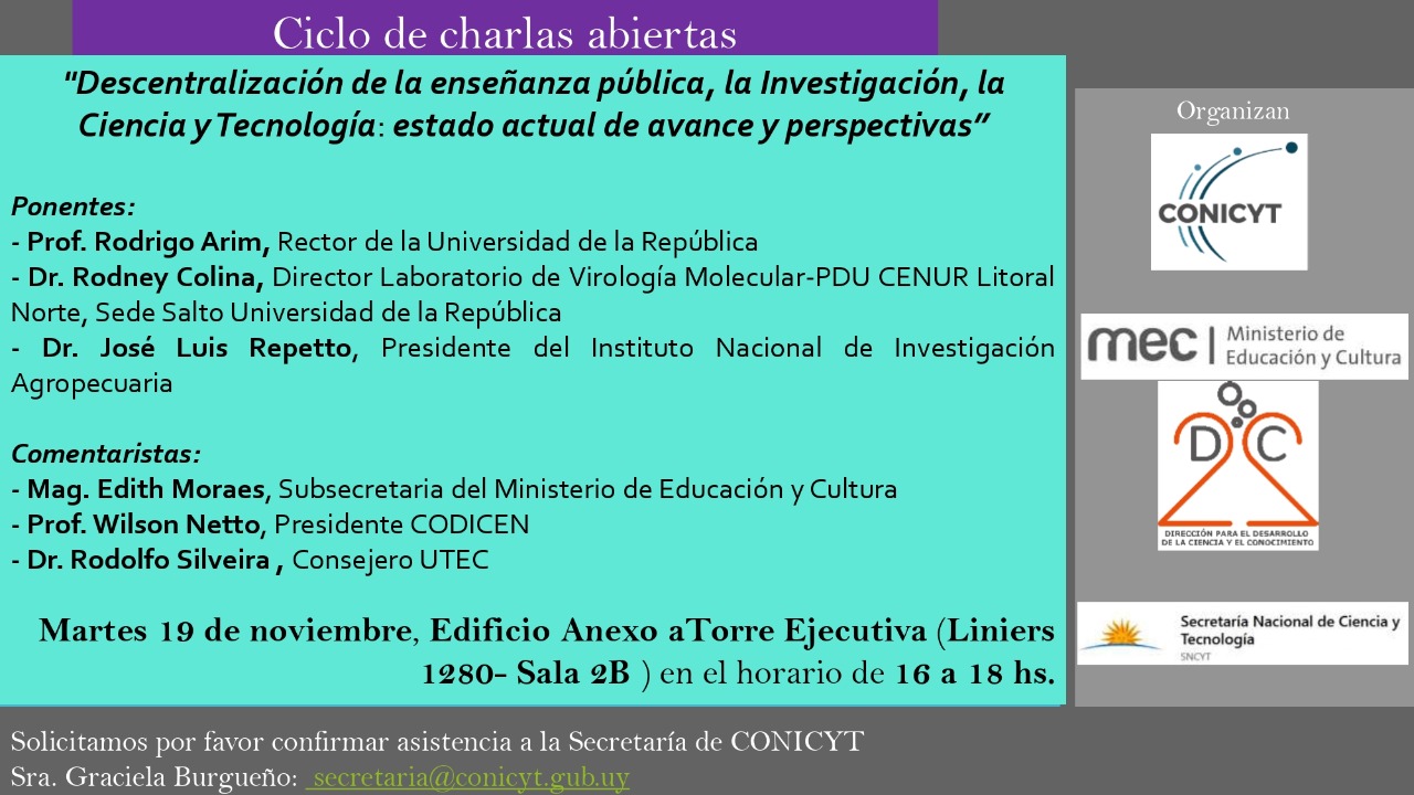El próximo martes 19 de noviembre de 16 a 18 horas se realizará la charla abierta "Descentralización de la enseñanza pública, la investigación, la ciencia y tecnología: estado actual de avances y perspectivas".La actividad será en el Edificio Anexo aTorre Ejecutiva (Liniers 1280- Sala 2B ) en el horario de 16 a 18 hs.Los ponentes seran el Lic. Rodrigo Arim, rector de la Universidad de la República; el Dr. Rodney Colina, director Laboratorio de Virología Molecular- PDU CENUR Litoral Norte, Sede Salto Universidad de la República; Dr. José Luis Repetto, presidente del Instituto Nacional de Investigación Agropecuaria. Además participarán como como comentaristas la Mag. Edith Moraes, Subsecretaria del Ministerio de Educación y Cultura; el Prof. Wilson Netto, Presidente CODICEN y el Dr. Rodolfo Silveira , Consejero UTEC.