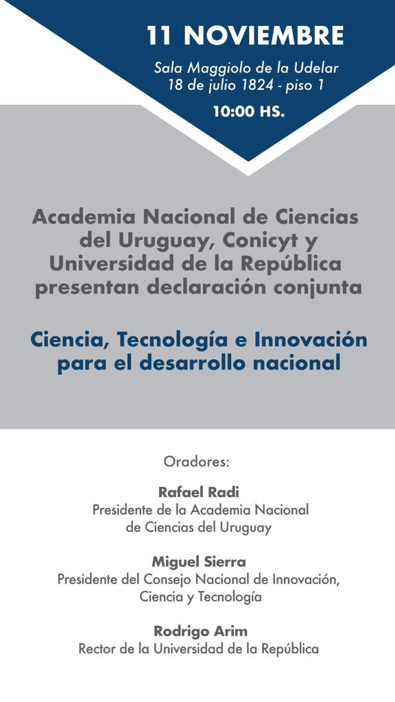 Teniendo en cuenta el contexto electoral actual del país y los desafíos a futuro, se declara por parte de las instituciones firmantes, sobre la “necesidad de seguir fortaleciendo las capacidades de Ciencia Tecnología e Innovación (CTI) en Uruguay e incrementando su uso efectivo para avanzar en el desarrollo humano y cultural, la sostenibilidad y la capacidad del país de pensarse a sí mismo”.