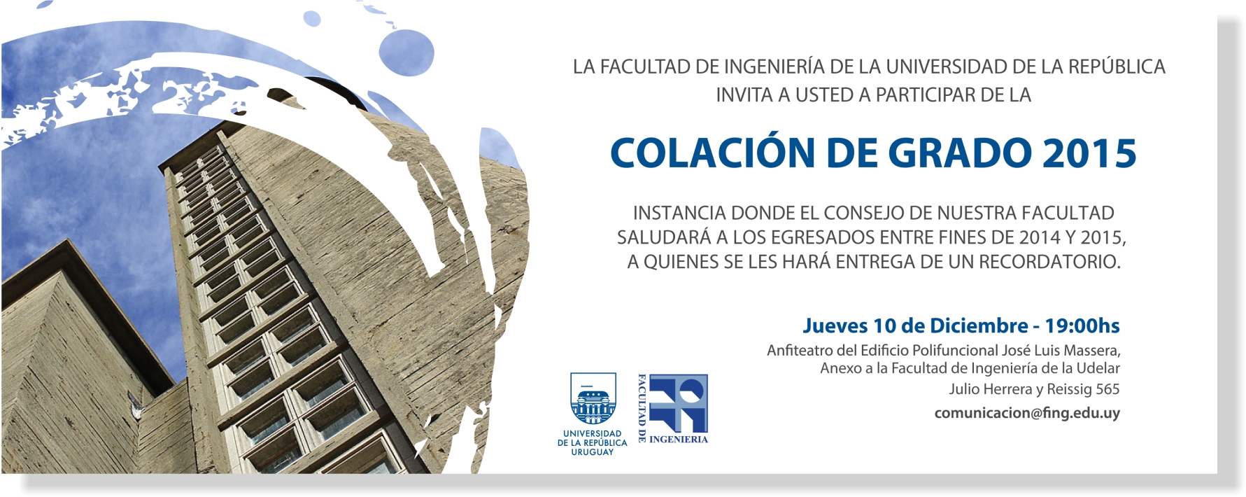 Fecha de inicio Jueves, 10 Diciembre, 2015 - 20:00 El próximo jueves 10 de diciembre de 2015 se realizará la tradicional Colación de Grado de nuestra Facultad.En esta oportunidad se homenajeará a los egresados de fines de 2014 y 2015.