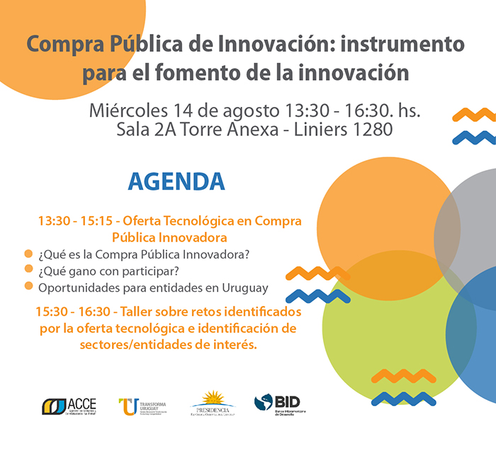 La Agencia de Compras y Contrataciones del Estado (ACCE) y Transforma Uruguay (TU), con el apoyo del Banco Interamericano de Desarrollo (BID) organizarán un taller cuyo objetivo central es la inducción al marco teórico de las Compras Públicas para la Innovación. La actividad se realizará el miércoles 14 de agosto en la Sala 2A ubicada en el segundo piso de la Torre Ejecutiva Anexa (Liniers 1280).