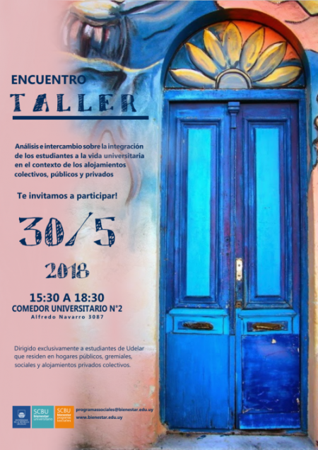 Bienestar Universitario, a través del Departamento de Programas y Proyectos Sociales, organizará el próximo miércoles 30 de mayo, un Encuentro Taller con la finalidad de intercambiar y analizar la integración de la población estudiantil a la vida universitaria en el contexto de los alojamientos colectivos públicos y privados.