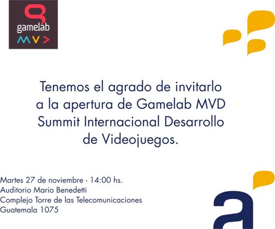 Se invita a participar de Gamelab MVD el martes 27 de noviembre a las 14:00 horas en el Auditorio Mario Benedetti del Complejo Torre de las Telecomunicaciones.