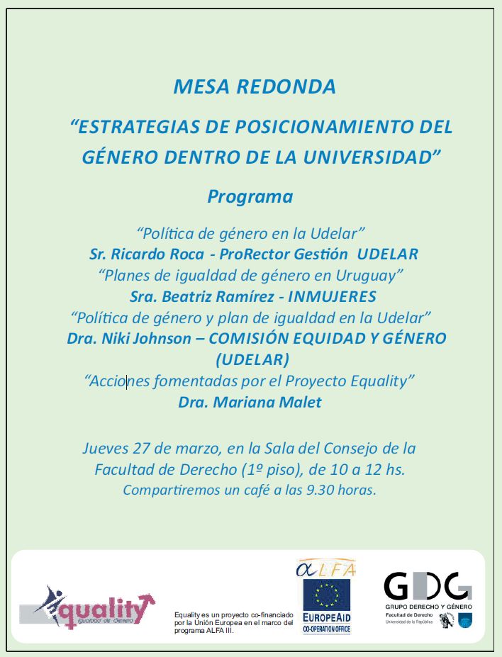 El próximo 27 de marzo se realizará la mesa redonda “Estrategias de posicionamiento del género dentro de la Universidad”en el Salón del Consejo de la Facultad de Derecho. La misma se enmarca dentro del Proyecto Equality y se tratarán temas sobre la necesidad de una política de género para la Universidad, así como la implantación de un plan de igualdad.