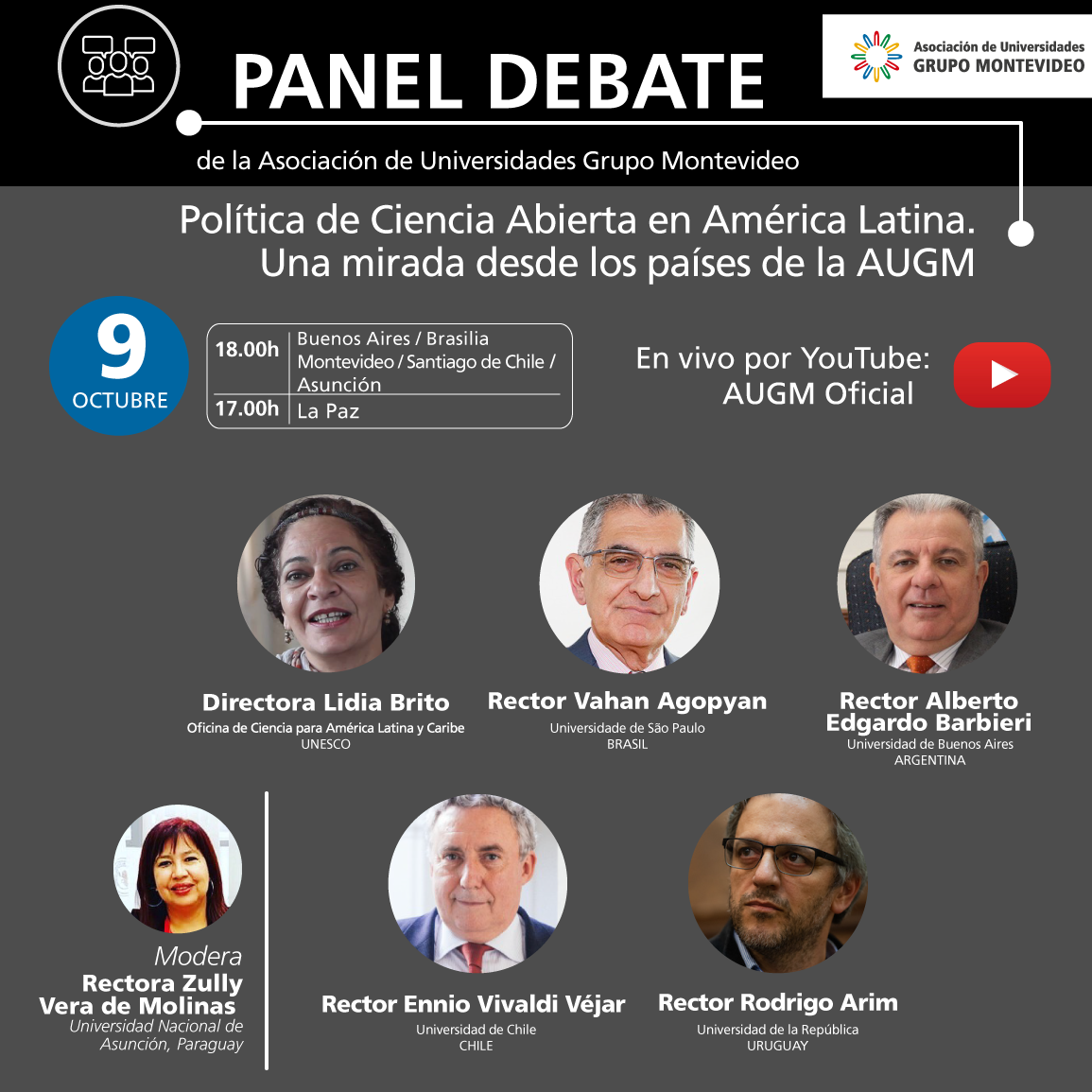 La actividad se llevará a cabo el 9 de octubre a las 18.00h (de Montevideo) y reunirá a Vahan Agopyan, rector de la Universidade de São Paulo,  Alberto Edgardo Barbieri, rector de la Universidad de Buenos Aires, Ennio Vivaldi Véjar, rector de la Universidad de Chile, Rodrigo Arim,  rector de la Universidad de la República, y a Lidia Brito, directora de la Oficina de Ciencia para América Latina y Caribe de la UNESCO. El panel será moderado por Zully Vera de Molinas, rectora de la Universidad Nacional de Asunción.