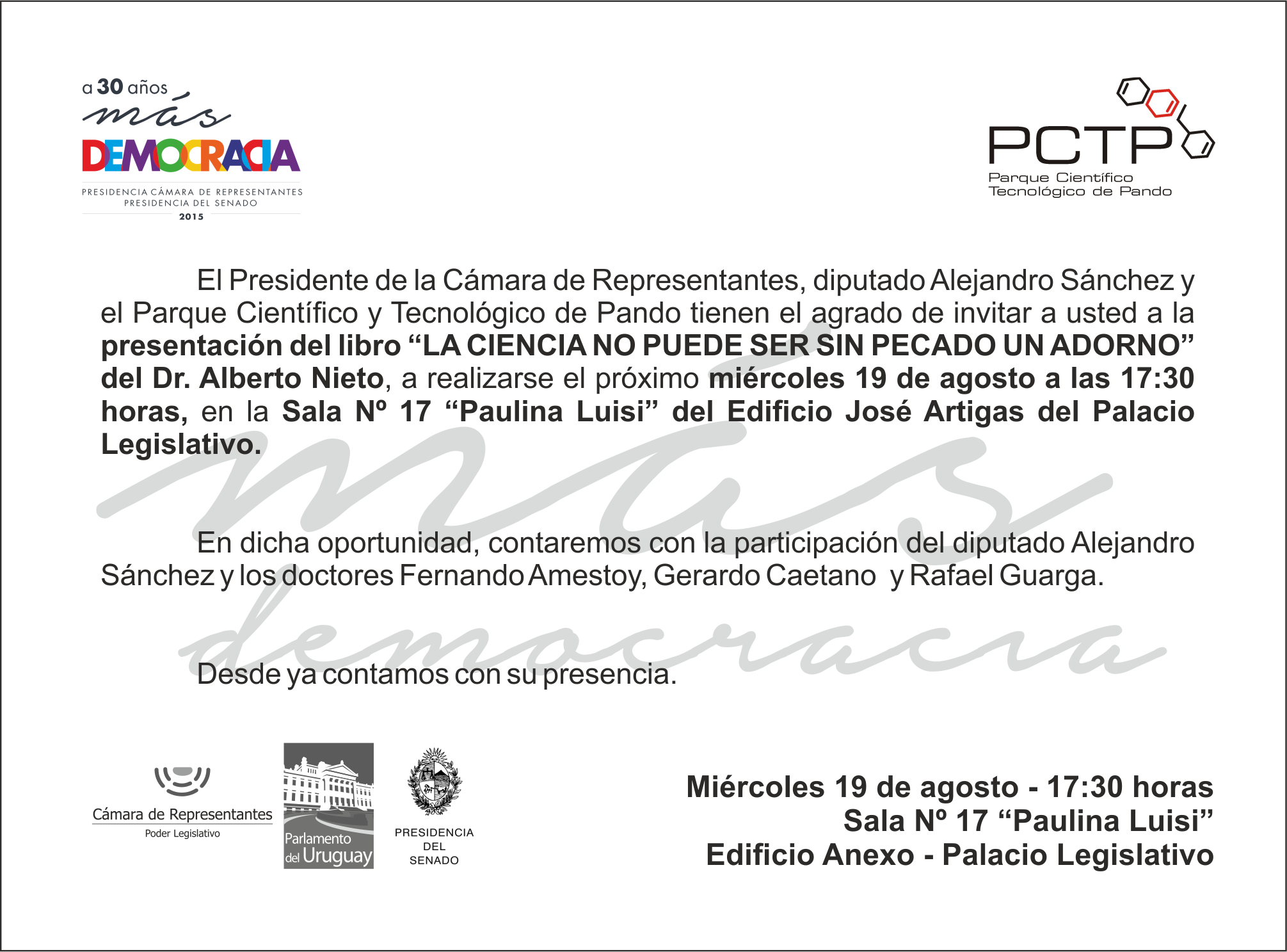 El Presidente de la Cámara de Representantes, diputado Alejandro Sánchez y el Parque Científico y Tecnológico de Pando invitan a la presentación del libro “LA CIENCIA NO PUEDE SER SIN PECADO UN ADORNO” del Dr. Alberto Nieto, a realizarse el próximo miércoles 19 de agosto a las 17:30 horas, en la Sala N° 17 “Paulina Luisi” del Edificio José Artigas del Palacio Legislativo.