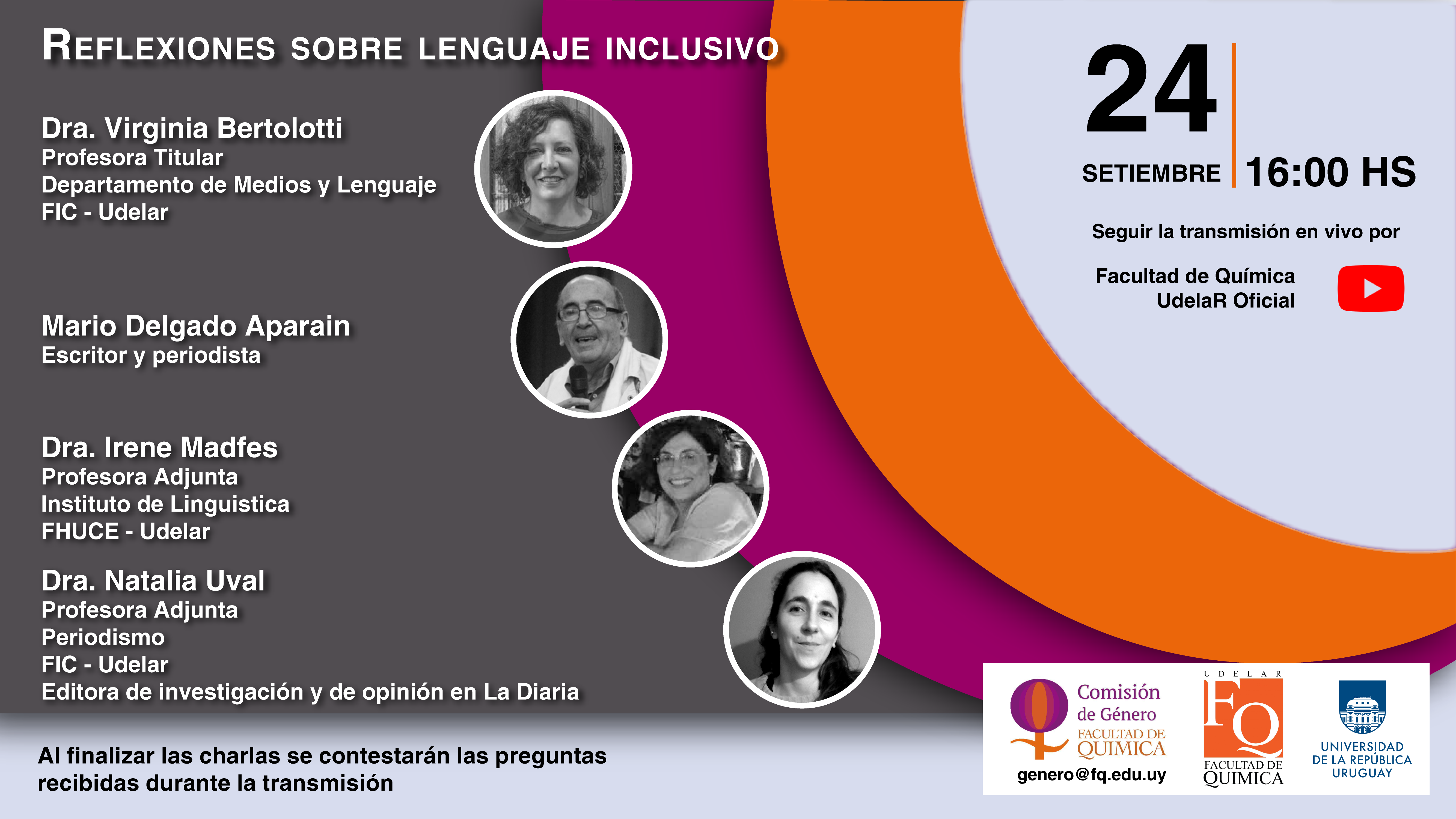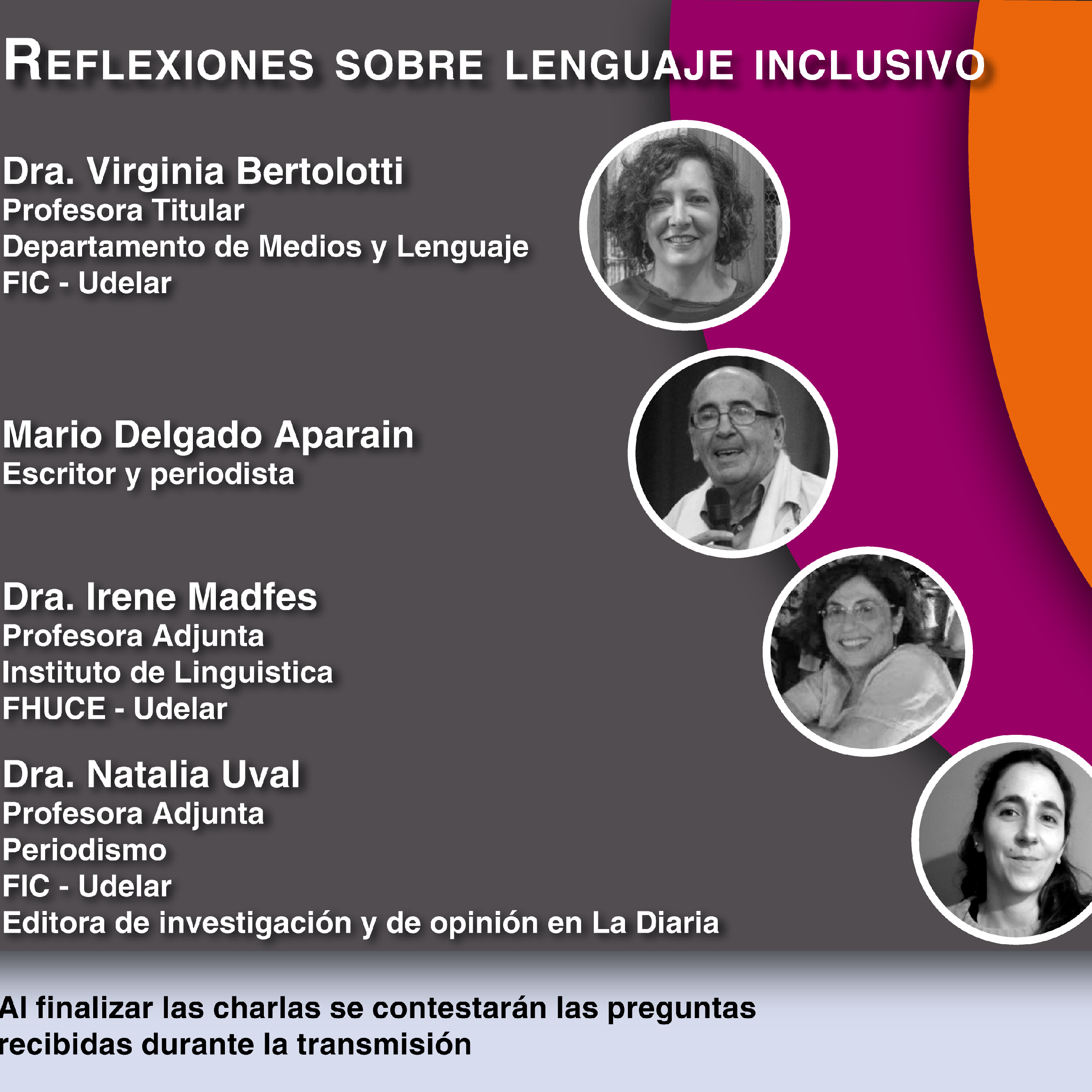 El próximo jueves 24 de setiembre, desde las 16 hs, se desarrollará vía Youtube live la mesa de diálogo "Reflexiones sobre lenguaje inclusivo", que contará con la presencia de académicos de las Facultades de Información y Comunicación, y de Humanidades y Ciencias de la Educación (Udelar), junto al escritor Mario Delgado Aparaín.