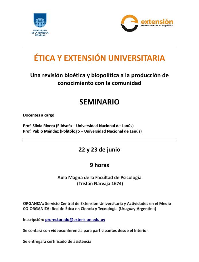El Seminario "Ética y Extensión Universitaria: Una revisión bioética y biopolítica a la producción de conocimiento con la comunidad" se llevará a cabo los días 22 y 23 de junio de 2015 en el Aula Magna de la Facultad de Psicología (Tristán Narvaja 1674).