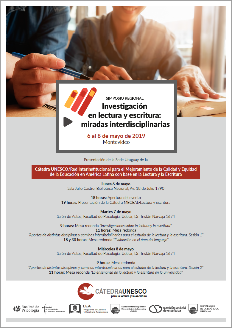 Del 6 al 8 de mayo, se realizará un simposio interdisciplinario sobre investigaciones en lectura y escritura. El evento cuenta con el apoyo del Espacio Interdisciplinario y la Comisión Sectorial de Enseñanza de la Universidad de la República y coincide con la inauguración en la Udelar de la sede de la Cátedra UNESCO/Red Interinstitucional para el Mejoramiento de la Calidad y Equidad de la Educación en América Latina con base en la Lectura y la Escritura.