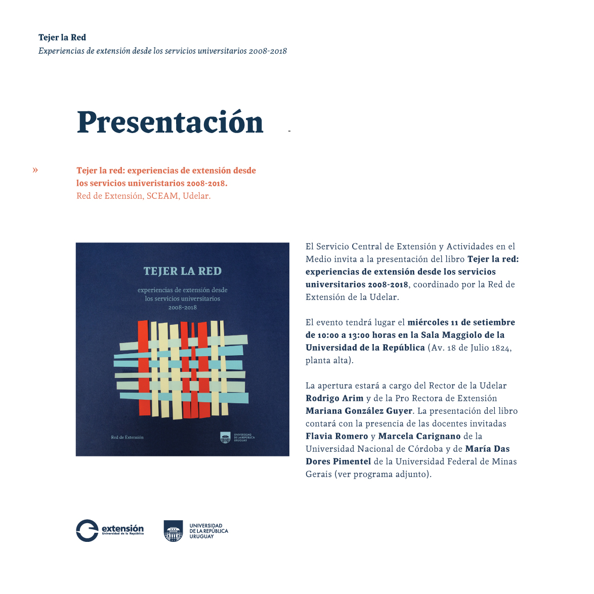 El Servicio Central de Extensión y Actividades en el Medio invita a participar en la presentación del libro "Tejer la red: experiencias de extensión desde los servicios universitarios 2008-2018”.