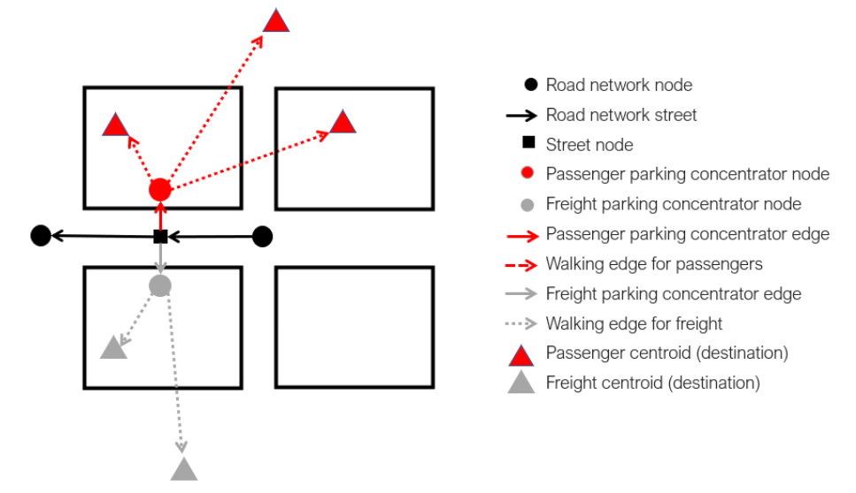 La planificación y gestión de la infraestructura pública utilizada para brindar apoyo a las alternativas de movilidad en los centros de las ciudades es una tarea desafiante dadas las restricciones de espacio físico y la variedad e intensidad de actividades a considerar simultáneamente. Presentamos un modelo para evaluar decisiones relacionadas con la asignación y uso de infraestructura pública dirigida al tráfico de automóviles, peatones y estacionamiento, en el contexto de un entorno urbano congestionado. Las rutas de los vehículos, las opciones de estacionamiento y sus interacciones se modelan simultáneamente para viajes de pasajeros y de carga, utilizando el concepto de equilibrio de tráfico. Se modelaron dos escenarios: el actual y una futura intervención prevista a corto plazo, consistente en la ampliación de la zona peatonal en tres calles del área de estudio. Debido a la reducción de espacio para tráfico y estacionamiento respecto al escenario actual, el modelo identifica consistentemente reducción de espacio para estacionamiento y redireccionamiento del flujo de tránsito de automóviles a partir de la intervención urbana propuesta. En este contexto, el modelo se puede utilizar, por ejemplo, para identificar la cantidad de demanda que debería transferirse al transporte público para mantener los costos de viaje en la situación original.