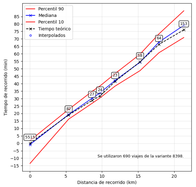 En segundo término, se analizaron las distintas variables involucradas en los tiempos de viaje de acuerdo con la literatura y se recopilaron y analizaron los datos disponibles para explicar los tiempos de viaje. En base a dicha recopilación, se establecen modelos regresivos para explicar tiempos de viaje en el transporte público. A partir de los datos de un mes de operación, se obtuvo un modelo sencillo, con alto poder explicativo (R2 de 0,88) y valores razonables frente a los datos empíricos disponibles para validación. A partir del modelo propuesto, se analizan los principales causantes de mayores tiempos de viaje en los servicios con relación a su planificación, se cuantifica la incidencia de cada uno y se proponen algunas medidas que pudiesen mejorar la operación.