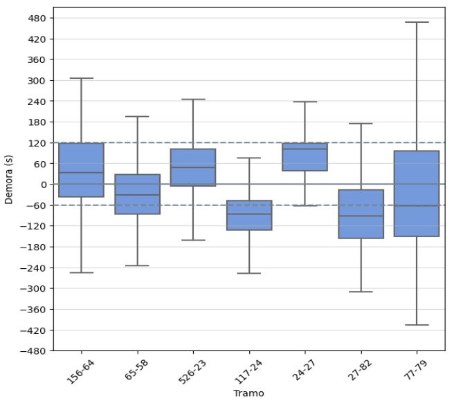 Ejemplo de diagrama de caja de demoras en trayecto de una línea de TP.