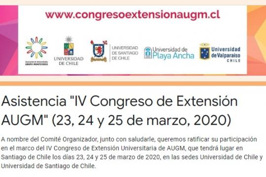 Se confirma que el IV Congreso de Extensión Universitaria tendrá lugar en Santiago de Chile los días 23, 24 y 25 de marzo de 2020, en las sedes Universidad de Chile y Universidad de Santiago de Chile.