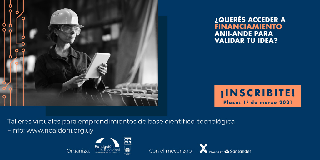 La Fundación Julio Ricaldoni invita a los interesados a participar del ciclo de talleres de “Validación de Ideas de Negocio” para trabajar en tu proyecto de base científico-tecnológica y postular a financiamiento de la Agencia Nacional de Desarrollo (ANDE) y la Agencia Nacional de Investigación e Innovación (ANII).