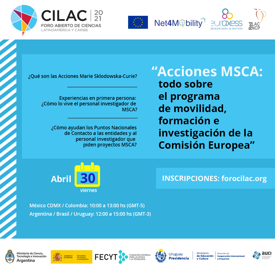 Esta nueva edición #Cilac2021 será una oportunidad para debatir, planificar y monitorear el papel de la ciencia de cara a la nueva normalidad, en el contexto del COVID-19, donde se presentará una sesión dirigida a las Acciones Marie Sklodowska-Curie (MSCA): todo sobre el programa de movilidad, formación e investigación de la Comisión Europea.