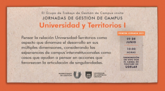 En el marco de las acciones desarrolladas por el Grupo de Trabajo en Gestión de Campus de la Universidad de la República, coordinado por el Prorrectorado de Gestión, el miércoles 9 de junio se llevará a cabo de forma virtual, la Jornada Temática “Universidad y Territorios I: sobre las articulaciones interinstitucionales y el desarrollo”.