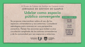 En el marco de las acciones desarrolladas por el Grupo de Trabajo en Gestión de Campus de la Universidad de la República, coordinado por el Prorrectorado de Gestión (PRG), el miércoles 7 de julio, de 10 a 12 horas, se llevará a cabo el segundo encuentro de las Jornadas de Gestión de Campus, titulado “Udelar como espacio público convergente”.