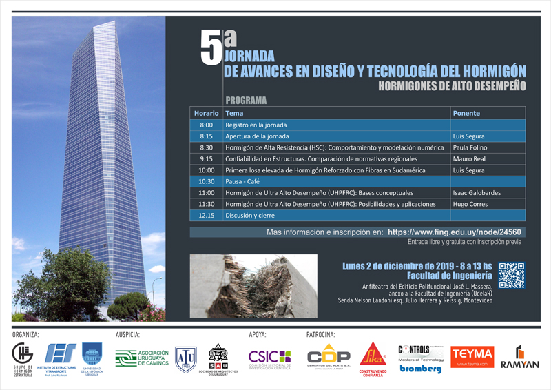 | LA JORNADA. En esta jornada se presentarán tres ponencias referidas a hormigones de alto desempeño, desde hormigones de alta resistencia (HAR), hasta hormigones de ultra Alto Desempeño (UHPFRC). Abarcando tanto aspectos tecnológicos como de diseño y cálculo, y mostrando algunas experiencias reales desarrolladas con este tipo de hormigón. Complementan la jornada una charla de Confiabilidad de las Estructuras y otra sobre la experiencia de losa elevada reforzada solo con fibras, realizada en Uruguay. |