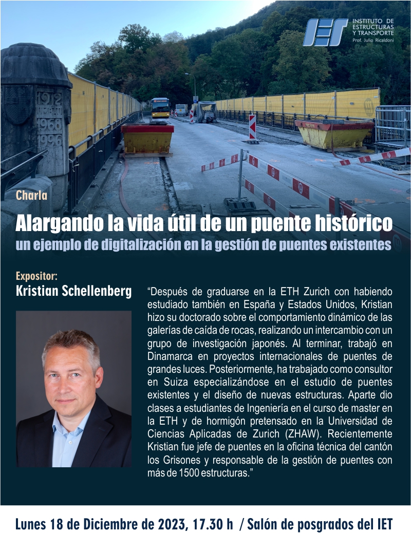 Este lunes 18 de diciembre de 2023 se realizará la charla "Alargando la vida útil de un puente histórico – un ejemplo de digitalización en la gestión de puentes existentes", dictada por Kristian Schellenberg, experto en ingeniería de puentes.