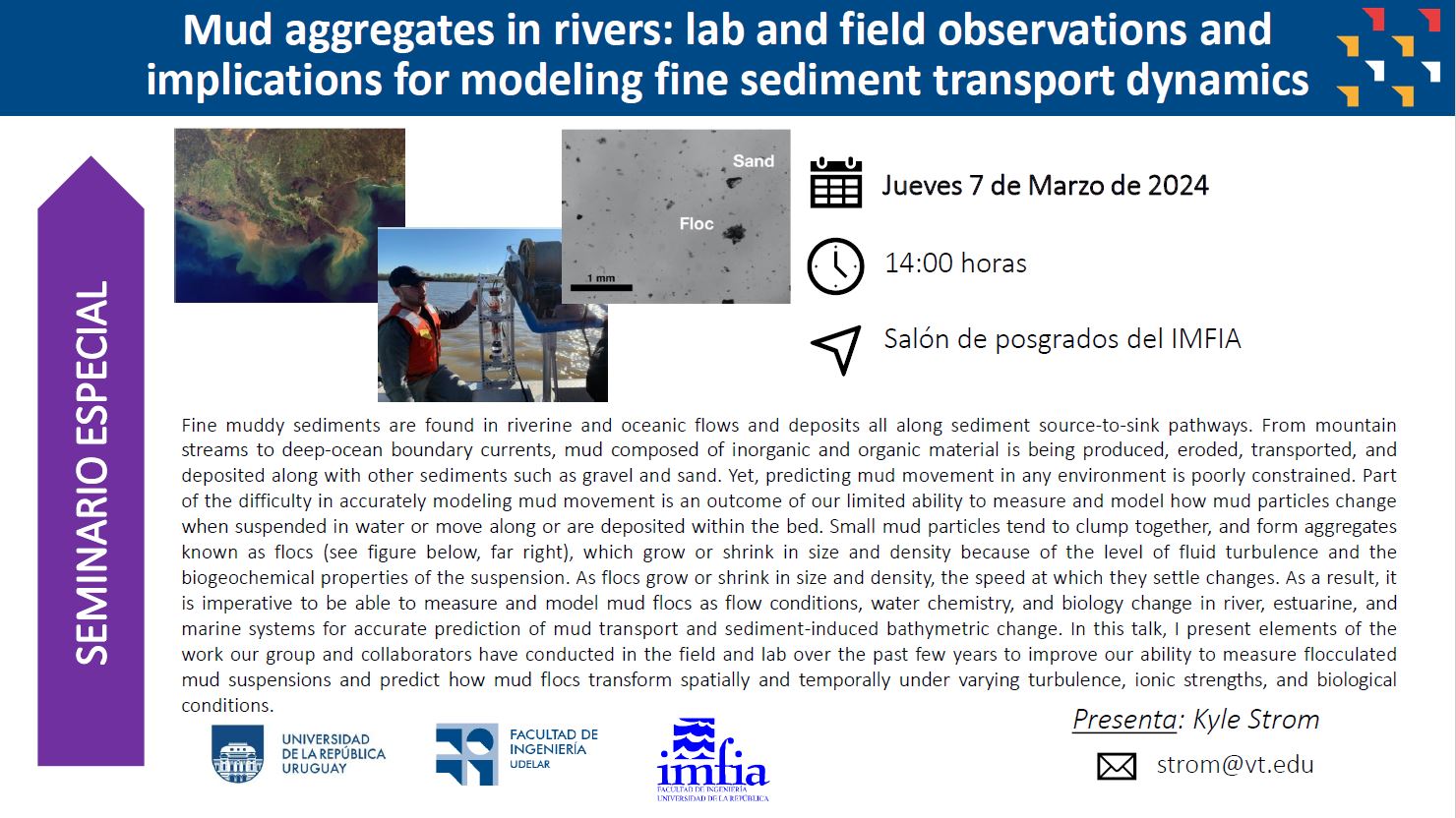 El IMFIa invita al Seminario Especial "Mud aggregates in rivers: lab and field observations andimplications for modeling fine sediment transport dynamics" a cargo del profesor Kyle Strom de Virginia Tech.