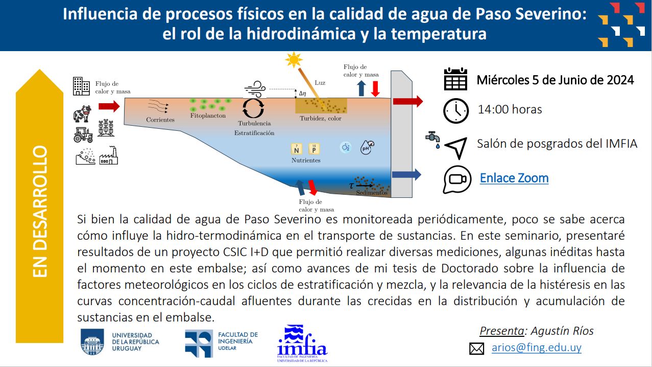 Si bien la calidad de agua de Paso Severino es monitoreada periódicamente, poco se sabe acerca de cómo influye la hidro-termodinámica en el transporte de sustancias. En este seminario, se presentarán resultados de un proyecto CSIC I+D que permitió realizar diversas mediciones, algunas inéditas hasta el momento en este embalse. Agustín Ríos presentará además, avances de su tesis de doctorado sobre la influencia de factores meteorológicos en los ciclos de estratificación y mezcla, y la relevancia de la histéresis en las curvas de concentración-caudal afluentes durante las crecidas en la distribución y acumulación de sustancias en el embalse.