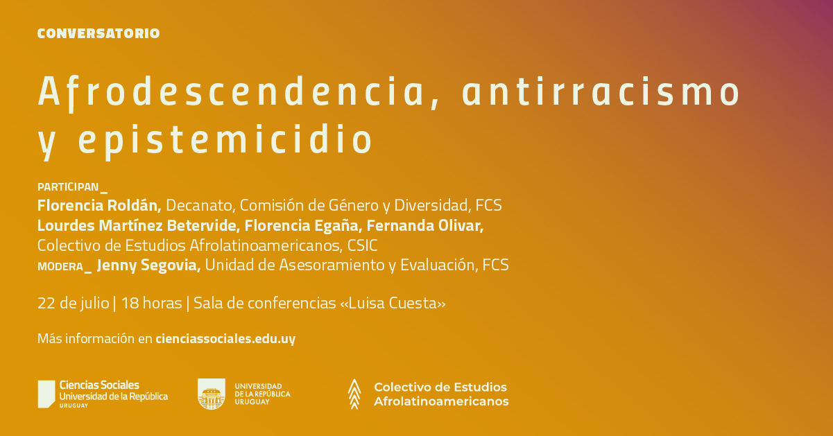 Organiza: Comisión de Género y Diversidad de la Facultad de Ciencias Sociales y Colectivo de Estudios Afrolatinoamericanos de la Comisión Sectorial de Investigación Científica de la Universidad de la República.